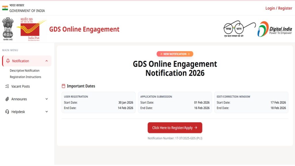 पोस्ट जीडीएस रिक्ति 2026: भारतीय डाक विभाग में ग्रामीण डाक सेवकों की 28740 भर्ती के लिए ऑनलाइन नामांकन की प्रक्रिया indiapost.gov.in/gdsonlineengagement पर 31 जनवरी से शुरू हो गई है। भर्ती का लिंक खोल दिया गया है। ध्यान दें नामांकन 31 जनवरी से 14 फरवरी के बीच हो सकता है जबकि आवेदन फॉर्म 2 फरवरी से 16 फरवरी के बीच जमा करना होगा। फॉर्म करेक्शन 18 फरवरी से 19 फरवरी के बीच हो सकता है। इस भर्ती में 10वीं पास युवा एप्लाई कर सकते हैं। ग्रामीण सेवक पद के लिए इच्छुक और उपयुक्त इंडिया पोस्ट की सूची वेबसाइट indiapostgdsonline.gov.in पर आवेदक आवेदन फॉर्म भरो। फीस जमा करने की आखिरी तारीख 16 फरवरी 2026 है, जबकि पहली मेरिट लिस्ट 28 फरवरी 2026 को जारी हो सकती है।